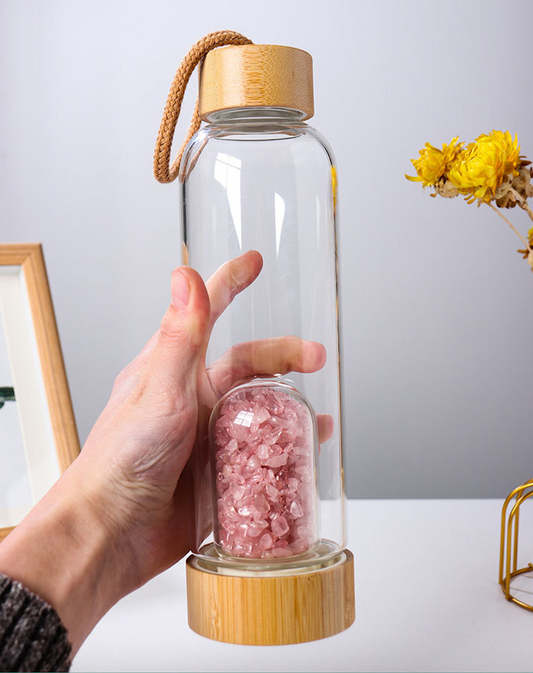 Crystal Water Bottle – Premium Borosilicate Glass with Bamboo Lid & Removable Gem-Base | Swap Amethyst, Citrine, Clear Quartz for Intent & Hydration
